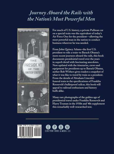 For much of U.S. history, a private Pullman car on a special train was the equivalent of today’s Air Force One for the president—allowing the most powerful man in the nation to conduct business wherever he was needed. From John Quincy Adams–the first U.S. president to ride a train–to Bill Clinton’s more recent journeys aboard the rails, this book documents presidential travel over the years in superb detail with fascinating anecdotes. Complete with the itineraries, crews and equipment for presidents up to Bill Clinton, author Bob Withers gives readers a snapshot of what it was like to travel by train as a president. From the details of Abraham Lincoln’s funeral train to the specifications of Franklin Roosevelt’s bulletproof railcar, this book will appeal to railroad enthusiasts and history buffs alike. Many rare photographs of the golden age of presidential travel under Franklin Roosevelt and Harry Truman in the 1930s and ‘40s supplement this remarkably well-researched text.