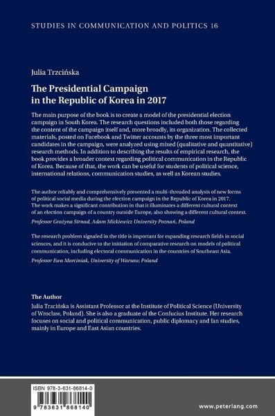 The main purpose of the book is to create a model of the presidential election campaign in South Korea. The research questions included both those regarding the content of the campaign itself and, more broadly, its organization. The collected materials, posted on Facebook and Twitter accounts by the three most important candidates in the campaign, were analyzed using mixed (qualitative and quantitative) research methods. In addition to describing the results of empirical research, the book provides a broader context regarding political communication in the Republic of Korea. Because of that, the work can be useful for students of political science, international relations, communication studies, as well as Korean studies.