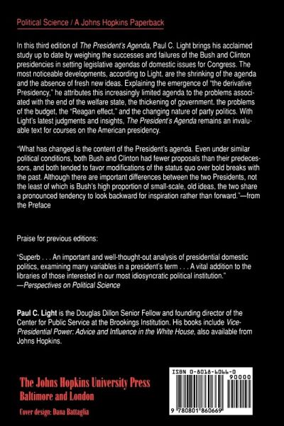 In this third edition of THE PRESIDENT'S AGENDA, Paul Light brings his acclaimed study up to date by weighing the successes and failures of the Bush and Clinton presidencies in setting a legislative agenda of domestic issues for Congress. The most noticeable development, according to Light, is the shrinking of the agenda and the absence of fresh new ideas. Explaining the emergence of "the derivative Presidency" he attributes this increasingly limited agenda to the problems associated with the end of the welfare state, the thickening of government, the problems of the budget, the "Reagan effect," and the changing nature of party politics. With Light's latest judgments and insights, THE PRESIDENT'S AGENDA remains an invaluable text for courses on the American presidency. "What has changed is the content of the President's agenda. Even under similar political conditions, both Bush and Clinton had fewer proposals than their predecessors, and both tended to favor modifications of the status quo over bold breaks with the past. Although there are important differences between the two Presidents, not the least of which is Bush's high proportion of small-scale, old ideas, the two share a pronounced tendency to look backward for inspiration rather than forward."-from the Preface Praise for previous editions: "Superb . . . An important and well-thought-out analysis of presidential domestic politics, examining many variables in a president's term . . . A vital addition to the libraries of those interested in our most idiosyncratic political institution."-Perspectives on Political Science