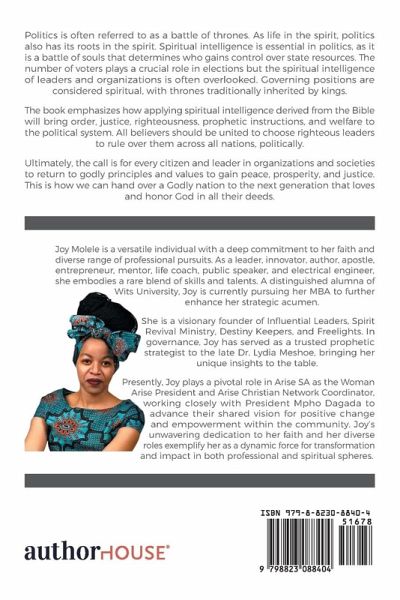 Politics is often referred to as a battle of thrones. As life in the spirit, politics also has its roots in the spirit. Spiritual intelligence is essential in politics, as it is a battle of souls that determines who gains control over state resources. The number of voters plays a crucial role in elections but the spiritual intelligence of leaders and organizations is often overlooked. Governing positions are considered spiritual, with thrones traditionally inherited by kings. The book emphasizes how applying spiritual intelligence derived from the Bible will bring order, justice, righteousness, prophetic instructions, and welfare to the political system. All believers should be united to choose righteous leaders to rule over them across all nations, politically. Ultimately, the call is for every citizen and leader in organizations and societies to return to godly principles and values to gain peace, prosperity, and justice. This is how we can hand over a Godly nation to the next generation that loves and honor God in all their deeds.
