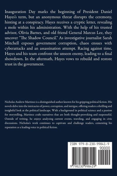 Inauguration Day marks the beginning of President Daniel Hayes's term, but an anonymous threat disrupts the ceremony, hinting at a conspiracy. Hayes receives a cryptic letter, revealing a mole within his administration. With the help of his trusted advisor, Olivia Barnes, and old friend General Marcus Lee, they uncover "The Shadow Council." As investigative journalist Sarah Mitchell exposes government corruption, chaos ensues with cyberattacks and an assassination attempt. Racing against time, Hayes and his team confront the unseen enemy, leading to a final showdown. In the aftermath, Hayes vows to rebuild and restore trust in the government.