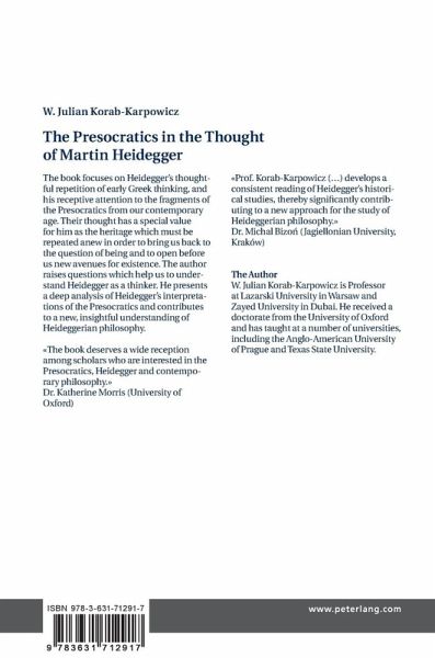 The book focuses on Heidegger's thoughtful repetition of early Greek thinking, and his receptive attention to the fragments of the Presocratics from our contemporary age. Their thought has a special value for him as the heritage which must be repeated anew in order to bring us back to the question of being and to open before us new avenues for existence. The author raises questions which help us to understand Heidegger as a thinker. He presents a deep analysis of Heidegger's interpretations of the Presocratics and contributes to a new, insightful understanding of Heideggerian philosophy.