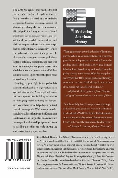 «Taking the country to war is a decision of the utmost gravity. When we've needed the nation's press to provide an independent institutional voice in guiding public deliberation, they have instead failed to learn from history and worked to sell a policy already in the works. With few exceptions since World War II the pattern has been disturbingly consistent, as Steve Hallock lays it out in this close reading of the editorial evidence.» (Stephen D. Reese, Jesse H. Jones Professor, College of Communication, University of Texas)