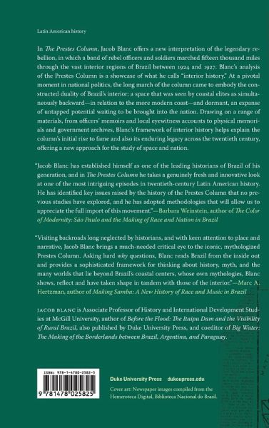 In The Prestes Column, Jacob Blanc offers a new interpretation of the legendary rebellion, in which a band of rebel officers and soldiers marched fifteen thousand miles through the vast interior regions of Brazil between 1924 and 1927. Blanc's analysis of the Prestes Column is a showcase of what he calls "interior history." At a pivotal moment in national politics, the long march of the column came to embody the constructed duality of Brazil's interior: a space that was seen by coastal elites as simultaneously backward-in relation to the more modern coast-and dormant, an expanse of untapped potential waiting to be brought into the nation. Drawing on a range of materials, from officers' memoirs and local eyewitness accounts to physical memorials and government archives, Blanc's framework of interior history helps explain the column's initial rise to fame and also its enduring legacy across the twentieth century, offering a new approach for the study of space and nation.