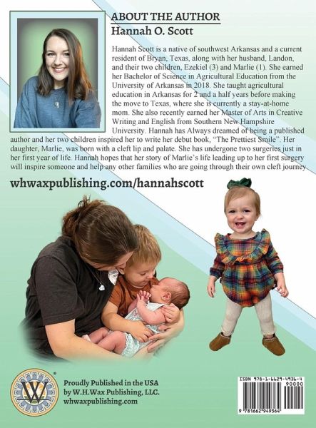 Hannah Scott is a native of southwest Arkansas and a current resident of Bryan, Texas, along with her husband, Landon, and their two children, Ezekiel (3) and Marlie (1). She earned her Bachelor of Science in Agricultural Education from the University of Arkansas in 2018. She taught agricultural education in Arkansas for 2 and a half years before making the move to Texas, where she is currently a stay-at-home mom. She also recently earned her Master of Arts in Creative Writing and English from Southern New Hampshire University. Hannah has always dreamed of being a published author and her two children inspired her to write her debut book, "The Prettiest Smile". Her daughter, Marlie, was born with a cleft lip and palate. She has undergone two surgeries just in her first year of life. Hannah hopes that her story of Marlie's life leading up to her first surgery will inspire someone and help any other families who are going through their own cleft journey.