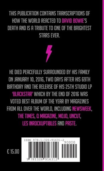This publication contains transcriptions of how the world reacted to David Bowie's death and is a tribute to one of the brightest stars ever. He died peacefully surrounded by his family on January 10, 2016, two days after his 69th birthday and the release of his 25th studio lp 'Blackstar' which by the end of 2016 was voted best album of the year by magazines from all over the world, including Newsweek, The Times, Q Magazine, MOJO, Uncut, Les Inrockuptibles and Paste. Included, the David Bowie studio discography Included a vast collection of magazines front cover
