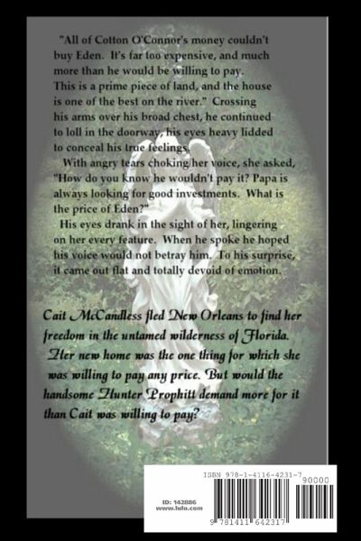 With the help of half-Seminole Indian, Hunter Prophitt, Cait McCandless flees New Orleans and the manipulations of her father for a new beginning in the Florida wilderness. Soon after her arrival, however, her dreams of a new life are threatened by an unexpected death, a suspicious business deal, and an imminent Indian war. WHAT PEOPLE ARE SAYING ABOUT "THE PRICE OF EDEN" Generally I don't read much historical fiction, but I found myself engrossed in this novel. The characters are ones I'll remember for a long time to come, which is something I can only say that about a handful of characters I've read in the past forty years...