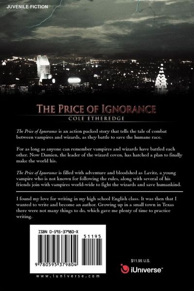 The Price of Ignorance is an action packed story that tells the tale of combat between vampires and wizards, as they battle to save the humane race. For as long as anyone can remember vampires and wizards have battled each other. Now Damien, the leader of the wizard coven, has hatched a plan to finally make the world his. The Price of Ignorance is filled with adventure and bloodshed as Lavitz, a young vampire who is not known for following the rules, along with several of his friends join with vampires world-wide to fight the wizards and save humankind.