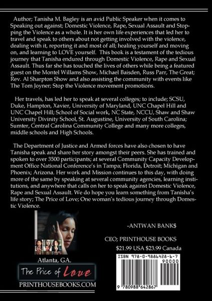 Author; Tanisha M. Bagley is an avid Public Speaker when it comes to Speaking out against; Domestic Violence, Rape, Sexual Assault and Stopping the Violence as a whole. It is her own life experiences that led her to travel and speak to others about not getting involved with the violence, dealing with it, reporting it and most of all; healing yourself and moving on, and learning to LOVE yourself. This book is a testament of the tedious journey that Tanisha endured through Domestic Violence, Rape and Sexual Assault. Thus far she has touched the lives of others while being a featured guest on the Montel Willams show, Michael Baisden, Russ Parr, The Great; Rev. Al Sharpton Show and also assisting the community with events like The Tom Joyner; Stop the Violence movement promotions. Her travels, has led her to speak at several colleges; to include; SCSU, Duke, Hampton, Xavier, University of Maryland, UNC Chapel Hill and UNC Chapel Hill; School of Social work, NC State, NCCU, Shaw and Shaw University Divinity School, St. Augustine, University of South Carolina; Sumter, Central Carolina Community College and many more colleges, middle schools and High Schools. The Department of Justice and Armed forces have also chosen to have Tanisha speak and share her story amongst their peers. She has trained and spoken to over 3500 participants; at several Community Capacity Development Office National Conference's in Tampa; Florida, Detroit; Michigan and Phoenix; Arizona. Her work and Mission continues to this day, with doing more of the same by speaking at several community agencies, learning institutions, and anywhere that calls on her to speak against Domestic Violence, Rape and Sexual Assault. We do hope you learn something from Tanisha's life story; The Price of Love; One woman's tedious journey through Domestic Violence. -ANTWAN BANK$ CEO; PRINTHOUSE BOOKS