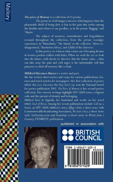 The price of Memory is a collection of 63 poems. The poems in vivid imagery uncover what happens when the pleasurable thrill of being alive is lost in the pain that settles among the familiar and refuses to say goodbye, as in the poems 'Baggage' and 'Maybe.' The subject of memory, remembrance and forgetfulness resound throughout the collection, from the private nostalgic experiences in 'Wastelands,' 'The Island,' to the collective 'Africa re-disappointed,' 'Borderless Africa,' and 'Child of the Universe.' In this poetry, we witness what comes out of keeping dreams in trouser pockets ridden with holes. When we send the eye to look into the future, with shock we discover that the future came.what can take away the pain and cold anger is the indomitable will that purposes to shed off memory like a cloak. Mildred Kiconco Barya is a writer and poet. She has written short-stories and essays for various publications, features and travel articles for newspapers. Her first collection of poetry titled: Men Love Chocolates But They Don't Say won the National Award for poetry publication 2002. The Price of Memory is her second poetry collection. Her current writings highlight HIV/AIDS issues, religious cults and the pursuit of identity and belonging. Mildred lives in Uganda, her homeland and works on her novel titled: Soul of Rivers. Among her recent publications include Call me a Panda, an HIV/AIDS children's story, Effigy Child, a short story with Commonwealth Broadcasting Association, We Seek a Face, a short story with Authorme.com and Raindrops a short story in Words from a Granary, FEMRITE publication.