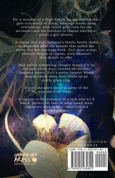 For a member of a High Family on the matriarchal, gem-rich world of Tanar, marriage weeks mean celebration, with lavish gifts even for the servants - and the freedom to choose whichever suitor a girl desires. A shame that Zuli Yalsmon's family barely ranks as Regarded after the assault that exiled her sister. For her marriage week, Zuli must accept whoever deigns to appear, with whatever they decide to offer. And unless something changes drastically in the next three days, instead of valuable business assets, Zuli's entire future? Worth exactly three shiny river rocks on an overly plain ring. If only she knew the real name of the man she truly loves... A rags-to-riches romance in a lush new sci fi world, perfect for fans of whip-smart main characters with hidden identities and secrets aplenty.