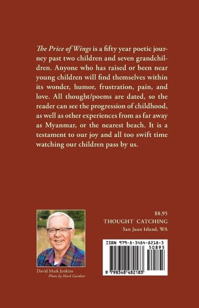 The Price of Wings is a fifty year poetic journey past two children and seven grandchildren. Anyone who has raised or been near young children will find themselves within its wonder, humor, frustration, pain, and love. All thought/poems are dated, so the reader can see the progression of childhood, as well as other experiences from as far away as Myanmar, or the nearest beach. It is a testament to our joy and all too swift time watching our children pass by us.