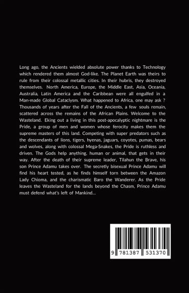 Long ago, the Ancients wielded absolute power thanks to Technology which rendered them almost God-like. The Planet Earth was theirs to rule from their colossal metallic cities. In their hubris, they destroyed themselves. North America, Europe, the Middle East, Asia, Oceania, Australia, Latin America and the Caribbean were all engulfed in a Man-made Global Cataclysm. What happened to Africa, one may ask ? Thousands of years after the Fall of the Ancients, a few souls remain, scattered across the remains of the African Plains. Welcome to the Wasteland. Eking out a living in this post-apocalyptic nightmare is the Pride, a group of men and women whose ferocity makes them the supreme masters of this land. Competing with super predators such as the descendants of lions, tigers, hyenas, jaguars, coyotes, pumas, bears and wolves, along with colossal Mega-Snakes, the Pride is ruthless and driven. The Gods help anything, human or animal, that gets in their way. After the death of their supreme leader, Tilahun the Brave, his son Prince Adamu takes over. The secretly bisexual Prince Adamu will find his heart tested, as he finds himself torn between the Amazon Lady Chioma, and the charismatic Baro the Wanderer. As the Pride leaves the Wasteland for the lands beyond the Chasm, Prince Adamu must defend what's left of Mankind...