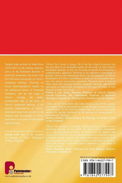 Despite wide acclaim for John Owen (1616-1683) as the leading representative of the Reformed doctrine of particular atonement, a thorough examination of Owen's views on the atonement has yet to be undertaken. This work is the first full-scale monograph on Owen's atonement theology and therefore fills the apparent lacuna. Drawing on recent historiographical studies on the intellectual history of Protestant Orthodoxy and the full range of Owen's writings, the author demonstrates that at the heart of Owen's atonement theology is his peculiar understanding of Christ's priesthood conceived in terms of the oblation and intercession of Christ, performed in the states of humiliation and exaltation. COMMENDATION "Edwin Tay presents a vivid and valuable portrait of John Owen's atonement theology. His book, elegantly written and meticulously researched, brings a fresh and original approach to a key theme in Owen's writings." - Susan Hardman Moore, University of Edinburgh, UK