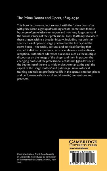 This book is concerned not so much with the 'prima donna' as with prime donne: a group of working artists (sometimes famous but more often relatively unknown and now long forgotten) and the circumstances of their professional lives. It attempts to locate these singers within a broader history, including not only the specificities of operatic stage practice but the life beyond the opera house - the social, cultural and political framing that shaped individual experience, artistic endeavour and audience reception. Rutherford addresses questions such as the multiple discourses on the image of the singer and their impact on the changing profile of the professional artist from figlia dell'arte at the beginning of the era to middle-class woman at the end; the aspect of the 'stage mother' and patronage; issues of vocal training and tuition; professional life in the operatic market-place; and performance (both vocal and dramatic) conventions and practices.