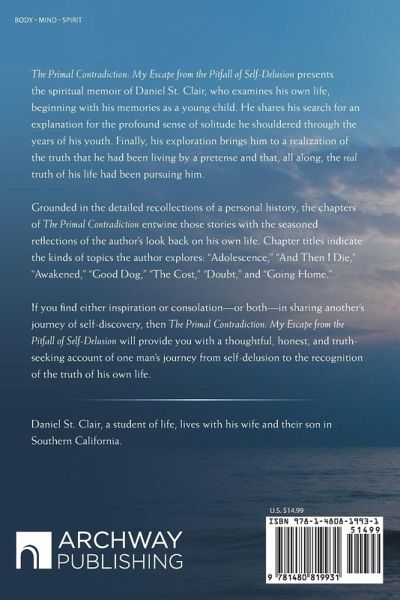 The Primal Contradiction: My Escape from the Pitfall of Self-Delusion presents the spiritual memoir of Daniel St. Clair, who examines his own life, beginning with his memories as a young child. He shares his search for an explanation for the profound sense of solitude he shouldered through the years of his youth. Finally, his exploration brings him to a realization of the truth that he had been living by a pretense and that, all along, the real truth of his life had been pursuing him. Grounded in the detailed recollections of a personal history, the chapters of The Primal Contradiction entwine those stories with the seasoned reflections of the author's look back on his own life. Chapter titles indicate the kinds of topics the author explores: "Adolescence," "And Then I Die," "Awakened," "Good Dog," "The Cost," "Doubt," and "Going Home." If you find either inspiration or consolation-or both-in sharing another's journey of self-discovery, then The Primal Contradiction: My Escape from the Pitfall of Self-Delusion will provide you with a thoughtful, honest, and truth-seeking account of one man's journey from self-delusion to the recognition of the truth of his own life.