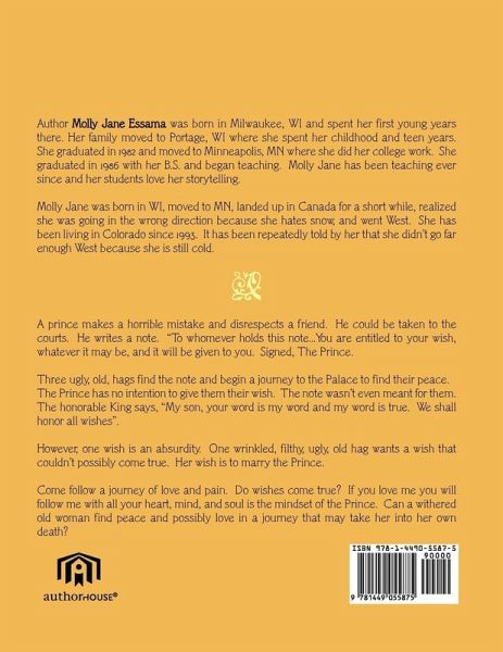 A prince makes a horrible mistake and disrespects a friend. He could be taken to the courts. He writes a note. "To whomever holds this note...You are entitled to your wish, whatever it may be, and it will be given to you. Signed, The Prince. Three ugly, old, hags find the note and begin a journey to the Palace to find their peace. The Prince has no intention to give them their wish. The note wasn't even meant for them. The honorable King says, "My son, your word is my word and my word is true. We shall honor all wishes". However, one wish is an absurdity. One wrinkled, filthy, ugly, old hag wants a wish that couldn't possibly come true. Her wish is to marry the Prince. Come follow a journey of love and pain. Do wishes come true? If you love me you will follow me with all your heart, mind, and soul is the mindset of the Prince. Can a withered old woman find peace and possibly love in a journey that may take her into her own death?