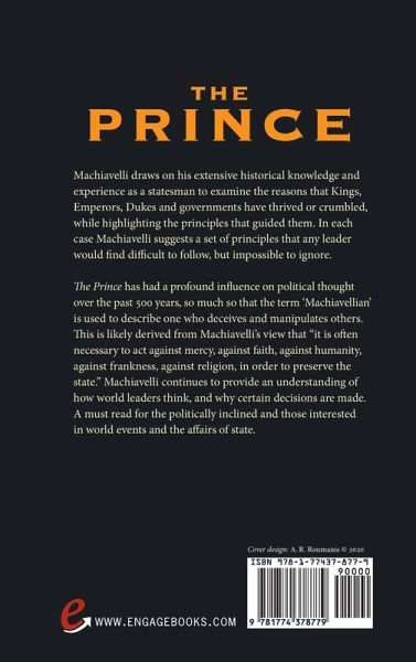 Machiavelli draws on his extensive historical knowledge and experience as a statesman to examine the reasons that Kings, Emperors, Dukes and governments have thrived or crumbled, while highlighting the principles that guided them. In each case Machiavelli suggests a set of principles that any leader would find difficult to follow, but impossible to ignore. The Prince has had a profound influence on political thought over the past 500 years, so much so that the term 'Machiavellian' is used to describe one who deceives and manipulates others. This is likely derived from Machiavelli's view that "it is often necessary to act against mercy, against faith, against humanity, against frankness, against religion, in order to preserve the state." Machiavelli continues to provide an understanding of how world leaders think, and why certain decisions are made. A must read for the politically inclined and those interested in world events and the affairs of state.