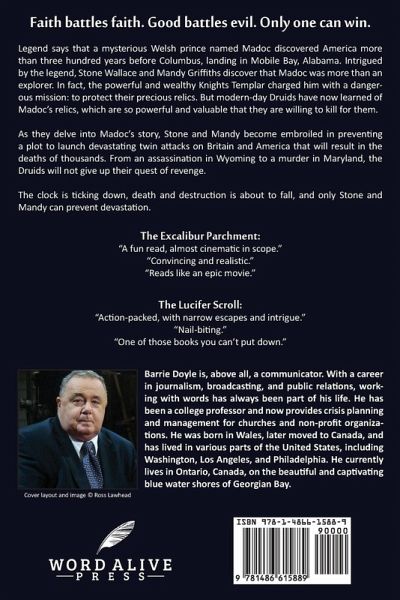 Faith battles faith. Good battles evil. Only one can win. Legend says that a mysterious Welsh prince named Madoc discovered America more than three hundred years before Columbus, landing in Mobile Bay, Alabama. Intrigued by the legend, Stone Wallace and Mandy Griffiths discover that Madoc was more than an explorer. In fact, the powerful and wealthy Knights Templar charged him with a dangerous mission: to protect their precious relics. But modern-day Druids have now learned of Madoc’s relics, which are so powerful and valuable that they are willing to kill for them. As they delve into Madoc’s story, Stone and Mandy become embroiled in preventing a plot to launch devastating twin attacks on Britain and America that will result in the deaths of thousands. From an assassination in Wyoming to a murder in Maryland, the Druids will not give up their quest of revenge. The clock is ticking down, death and destruction is about to fall, and only Stone and Mandy can prevent devastation.