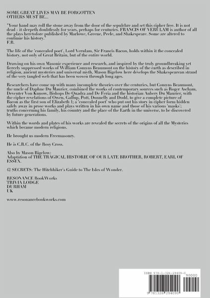 Some great lives may be forgotten - others must be. "Francis of Verulam is author of all the plays heretofore published by Marlowe, Greene, Peele, Shakespeare. Some are altered to continue the history."(F.B.) Bigelow's play, inspired by the works of Comyns Beaumont; in particular, 'The Private Life of the Virgin Queen', uses material from the ciphers extracted by Owen, Donnelly, Dodd et al., to give a picture of the concealed prince and poet who should have been king, and the oppressive times in which he wrote, where artistic, religious, political and philosophical ideas were censored so strictly that Draconian laws were introduced to prevent the true situation being dramatically portrayed, to the extent that the lower classes were not allowed to wear aristocratic clothing, after the manner of the Roman laws concerning the Royal Purple. The would-be tyrannical nature of the Queen is eclipsed only by the Macchiavellian machinations of her chief ally, Robert Cecil.