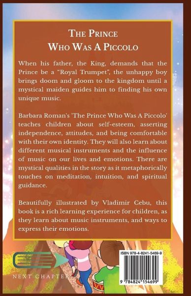 When his father, the King, demands that the Prince be a "Royal Trumpet", the unhappy boy brings doom and gloom to the kingdom until a mystical maiden guides him to finding his own unique music. Barbara Roman's 'The Prince Who Was A Piccolo' teaches children about self-esteem, asserting independence, attitudes, and being comfortable with their own identity. They will also learn about different musical instruments and the influence of music on our lives and emotions. There are mystical qualities in the story as it metaphorically touches on meditation, intuition, and spiritual guidance. Beautifully illustrated by Vladimir Cebu, this book is a rich learning experience for children, as they learn about music instruments, and ways to express their emotions.