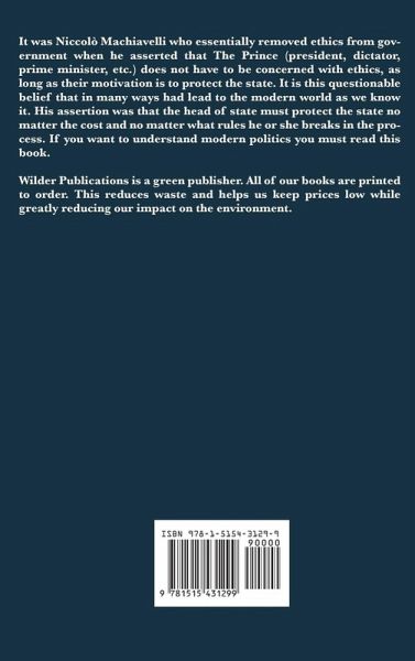 It was Niccolò Machiavelli who essentially removed ethics from government. He did it with this book, when he asserted that The Prince (president, dictator, prime minister, etc.) does not have to be concerned with ethics, as long as their motivation is to protect the state. It is this questionable belief that in many ways had lead to the modern world as we know it. His assertion was that the head of state must protect the state no matter the cost and no matter what rules he or she breaks in the process.
