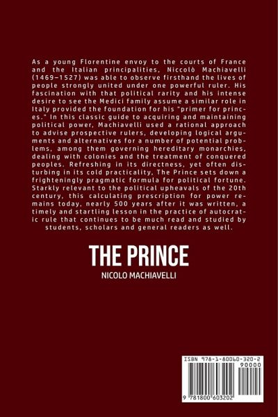 Do you want to read The Prince? If so then keep reading... As a young Florentine envoy to the courts of France and the Italian principalities, Niccolò Machiavelli (1469-1527) was able to observe firsthand the lives of people strongly united under one powerful ruler. His fascination with that political rarity and his intense desire to see the Medici family assume a similar role in Italy provided the foundation for his "primer for princes." In this classic guide to acquiring and maintaining political power, Machiavelli used a rational approach to advise prospective rulers, developing logical arguments and alternatives for a number of potential problems, among them governing hereditary monarchies, dealing with colonies and the treatment of conquered peoples. Refreshing in its directness, yet often disturbing in its cold practicality, The Prince sets down a frighteningly pragmatic formula for political fortune. Starkly relevant to the political upheavals of the 20th century, this calculating prescription for power remains today, nearly 500 years after it was written, a timely and startling lesson in the practice of autocratic rule that continues to be much read and studied by students, scholars and general readers as well. What are you waiting for The Prince is one click away, select the "Buy Now" button in the top right corner NOW!