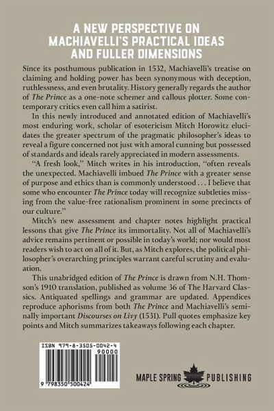 A New Perspective on Machiavelli's Practical Ideas and Fuller Dimensions Since its posthumous publication in 1532, Machiavelli’s treatise on claiming and holding power has been synonymous with deception, ruthlessness, and even brutality. History generally regards the author of The Prince as a one-note schemer and callous plotter. Some contemporary critics even call him a satirist. In this newly introduced and annotated edition of Machiavelli’s most enduring work, scholar of esotericism Mitch Horowitz elucidates the greater spectrum of the pragmatic philosopher’s ideas to reveal a figure concerned not just with amoral cunning but possessed of standards and ideals rarely appreciated in modern assessments. "A fresh look," Mitch writes in his introduction, “often reveals the unexpected. Machiavelli imbued The Prince with a greater sense of purpose and ethics than is commonly understood…I believe that some who encounter The Prince today will recognize subtleties missing from the value-free rationalism prominent in some precincts of our culture.” Mitch’s new assessment and chapter notes highlight practical lessons that give The Prince its immortality. Not all of Machiavelli’s advice remains pertinent or possible in today’s world; nor would most readers wish to act on all of it. But, as Mitch explores, the political philosopher’s overarching principles warrant careful scrutiny and evaluation. This unabridged edition of The Prince is drawn from N.H. Thomson’s 1910 translation, published as volume 36 of The Harvard Classics. Antiquated spellings and grammar are updated. Appendices reproduce aphorisms from both The Prince and Machiavelli’s seminally important Discourses on Livy (1531). Pull quotes emphasize key points and Mitch summarizes takeaways following each chapter.