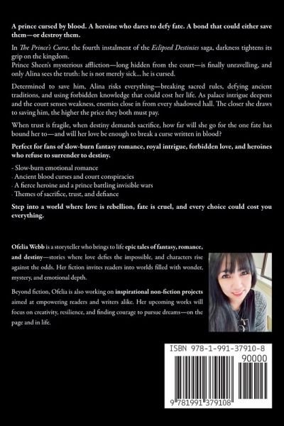 A prince cursed by blood. A heroine who dares to defy fate. A bond that could either save them-or destroy them. In The Prince's Curse, the fourth instalment of the Eclipsed Destinies saga, darkness tightens its grip on the kingdom. Prince Sheen's mysterious affliction-long hidden from the court-is finally unravelling, and only Alina sees the truth: he is not merely sick... he is cursed. Determined to save him, Alina risks everything-breaking sacred rules, defying ancient traditions, and using forbidden knowledge that could cost her life. As palace intrigue deepens and the court senses weakness, enemies close in from every shadowed hall. The closer she draws to saving him, the higher the price they both must pay. When trust is fragile, when destiny demands sacrifice, how far will she go for the one fate has bound her to-and will her love be enough to break a curse written in blood? Perfect for fans of slow-burn fantasy romance, royal intrigue, forbidden love, and heroines who refuse to surrender to destiny. Slow-burn emotional romance Ancient blood curses and court conspiracies A fierce heroine and a prince battling invisible wars Themes of sacrifice, trust, and defiance Step into a world where love is rebellion, fate is cruel, and every choice could cost you everything.