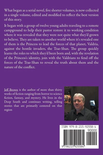 What began as a serial novel, five shorter volumes, is now collected in a single volume, edited and modified to reflect the best version of this story. It began with a group of twelve young adults traveling to a remote campground to help their pastor restore it to working condition where it was revealed that they were not quite what they'd grown to believe. They are taken to another world where it's revealed one of them is the Princess to lead the forces of that planet, Valdria, against the hostile invaders, the Trae-Shan. The group quickly learns the roles to which they'd been born and, with the revelation of the Princess's identity, join with the Valdrians to fend off the forces of the Trae-Shan to reveal the truth about them and the nature of the conflict.