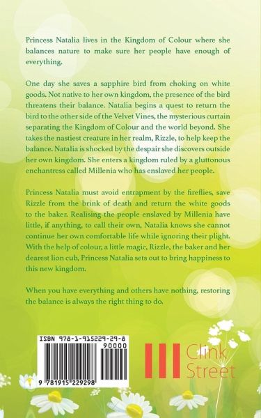 Princess Natalia lives in the Kingdom of Colour where she balances nature to make sure her people have enough of everything. One day she saves a sapphire bird from choking on white goods. Not native to her own kingdom, the presence of the bird threatens their balance. Natalia begins a quest to return the bird to the other side of the Velvet Vines, the mysterious curtain separating the Kingdom of Colour and the world beyond. She takes the nastiest creature in her realm, Rizzle, to help keep the balance. Natalia is shocked by the despair she discovers outside her own kingdom. She enters a kingdom ruled by a gluttonous enchantress called Millenia who has enslaved her people. Princess Natalia must avoid entrapment by the fireflies, save Rizzle from the brink of death and return the white goods to the baker. Realising the people enslaved by Millenia have little, if anything, to call their own, Natalia knows she cannot continue her own comfortable life while ignoring their plight. With the help of colour, a little magic, Rizzle, the baker and her dearest lion cub, Princess Natalia sets out to bring happiness to this new kingdom. When you have everything and others have nothing, restoring the balance is always the right thing to do.