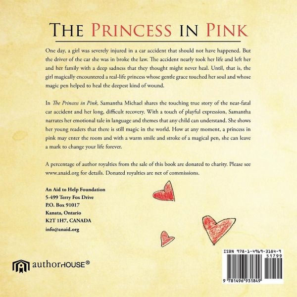 One day, a girl was severely injured in a car accident that should not have happened. But the driver of the car she was in broke the law. The accident nearly took her life and left her and her family with a deep sadness that they thought might never heal. Until, that is, the girl magically encountered a real-life princess whose gentle grace touched her soul and whose magic pen helped to heal the deepest kind of wound. In The Princess in Pink, Samantha Michael shares the touching true story of the near-fatal car accident and her long, difficult recovery. With a touch of playful expression, Samantha narrates her emotional tale in language and themes that any child can understand. She shows her young readers that there is still magic in the world. How at any moment, a princess in pink may enter the room and with a warm smile and stroke of a magical pen, she can leave a mark to change your life forever. A percentage of author royalties from the sale of this book are donated to charity. Please see www.anaid.org for details. Donated royalties are net of commissions. An Aid to Help Foundation 5-499 Terry Fox Drive P.O. Box 91017 Kanata, Ontario K2T 1H7, CANADA info@anaid.org