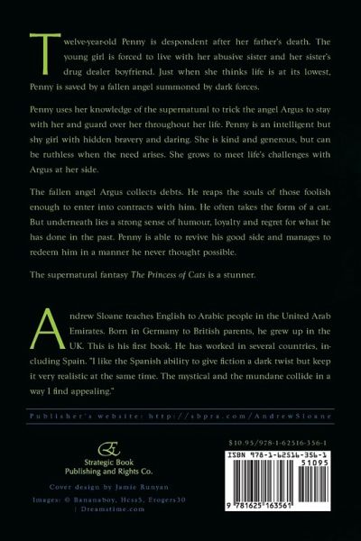 Twelve-year-old Penny is despondent after her father's death. The young girl is forced to live with her abusive sister and her sister's drug dealer boyfriend. Just when she thinks life is at its lowest, Penny is saved by a fallen angel summoned by dark forces. Penny uses her knowledge of the supernatural to trick the angel Argus to stay with her and guard over her throughout her life. Penny is an intelligent but shy girl with hidden bravery and daring. She is kind and generous, but can be ruthless when the need arises. She grows to meet life's challenges with Argus at her side. The fallen angel Argus collects debts. He reaps the souls of those foolish enough to enter into contracts with him. He often takes the form of a cat. But underneath lies a strong sense of humour, loyalty and regret for what he has done in the past. Penny is able to revive his good side and manages to redeem him in a manner he never thought possible. The supernatural fantasy The Princess of Cats is a stunner. Andrew Sloane teaches English to Arabic people in the United Arab Emirates. Born in Germany to British parents, he grew up in the UK. This is his first book. He has worked in several countries, including Spain. "I like the Spanish ability to give fiction a dark twist but keep it very realistic at the same time. The mystical and the mundane collide in a way I find appealing." Publisher's website: http://sbpra.com/AndrewSloane