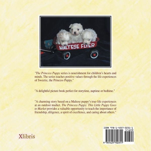 The Princess Puppy series is nourishment for children's hearts and minds. The series teaches positive values through the life experiences of Sweetie, the Princess Puppy. A delightful picture book perfect for storytime, naptime or bedtime. A charming story based on a Maltese puppy's true-life experiences at an outdoor market. The Princess Puppy: This Little Puppy Goes to Market provides a valuable opportunity to teach the importance of friendship, diligence, a spirit of excellence, and caring about others.