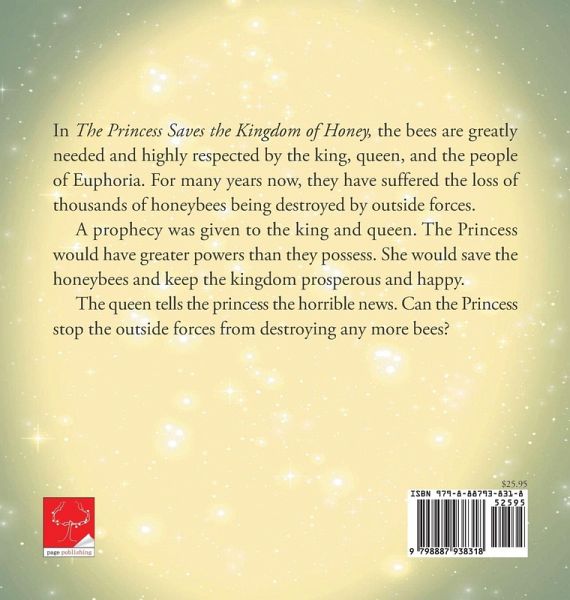 In The Princess Saves the Kingdom of Honey, the bees are greatly needed and highly respected by the king, queen, and the people of Euphoria. For many years now, they have suffered the loss of thousands of honeybees being destroyed by outside forces. A prophecy was given to the king and queen. Princess would have greater powers than they possess. She would save the honeybees and keep the kingdom prosperous and happy. The queen tells the princess the horrible news. Can Princess stop the outside forces from destroying any more bees? The news made her very sad; however, she has the solution: she will use her supernatural power!