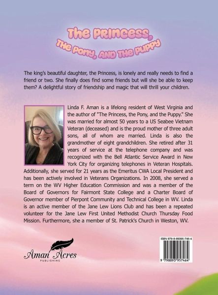 Linda F. Aman is a lifelong resident of West Virginia and the author of "The Princess, the Pony, and the Puppy." She was married for almost 50 years to a US Seabee Vietnam Veteran (deceased) and is the proud mother of three adult sons, all of whom are married. Linda is also the grandmother of eight grandchildren. She retired after 31 years of service at the telephone company and was recognized with the Bell Atlantic Service Award in New York City for organizing telephones in Veteran Hospitals. Additionally, she served for 21 years as the Emeritus CWA Local President and has been actively involved in Veterans Organizations. In 2008, she served a term on the WV Higher Education Commission and was a member of the Board of Governors for Fairmont State College and a Charter Board of Governor member of Pierpont Community and Technical College in WV. Linda is an active member of the Jane Lew Lions Club and has been a repeated volunteer for the Jane Lew First United Methodist Church Thursday Food Mission. Furthermore, she a member of St. Patrick's Church in Weston, WV.