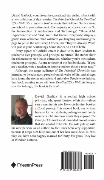 David Garlick, your favourite educational storyteller, is back with a new collection of short stories: The Principal Chronicles Two/Too/II/As Well. It's a 'mostly true' memoir that follows Garlick from pre-school to post retirement. The majority of stories, such as "At the Intersection of Adolescence and Technology," "Three A.M. Hypochondria," and "Kid, Your Dad Knows Everybody," display a gentle sense of humour that will have you laughing and turning the page to get to the next story. Others, like "They've Already Won," will grab at your heartstrings. Some stories do a bit of both. Every aspect of Garlick's career is dealt with, from student to teacher to vice-principal and principal to retiree. The stories show the rollercoaster ride that is education, whether you're the student, teacher or principal. As one reviewer of the first book said, "If you are a teacher, were a teacher, or know a teacher, this is a must read!" Although the target audience of The Principal Chronicles was intended to be educators, people from all walks of life, and all ages have found the stories relatable and enjoyable. People who finished that book wanting more will love Two/Too/II/As Well. As long as you like to laugh, this book is for you!