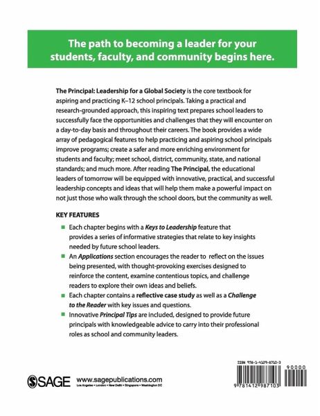 The Principal: Leadership for a Global Society is the core textbook for aspiring and practicing K-12 school principals. Taking a practical and research-grounded approach, this inspiring text prepares school leaders to successfully face the challenges that they will deal with on a day-to-day basis and throughout their careers. From curriculum development to staff development to policy and discipline, it addresses the most up-to-date practices in developing leadership skills. The book provides a wide array of pedagogical features to help practicing and aspiring school principals improve programs, create a safer and more enriching environment for students and faculty; meet school, district, community, state, and national ideologies and standards; and much more. After reading The Principal, the educational leaders of tomorrow will be equipped with innovative, practical, and successful leadership concepts and ideas that will help them make a powerful impact on not just those who walk through the school doors, but the community as well.