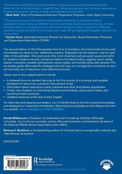 The second edition of The Principalship from A to Z provides a set of tools that can be used immediately to improve your leadership practice. Organized into 26 chapters-one for each letter of the alphabet-this book covers the most important and prevalent issues and skills for leaders in today's schools, including matters of limited funding, juggling social media, teacher evaluation, student achievement, school safety, and collaborating with parents. This accessible guide offers specific strategies that will help you navigate the complexity of your job and help you to become a more effective principal. Topics new to this updated edition include: A renewed focus on student learning as the first priority of a principal and updated strategies for becoming a powerful instructional coach Information about restorative justice practices and other disciplinary approaches Timely new chapters on motivating teachers and students, using social media, and handling limited resources Updated resources at the end of each chapter For both new and experienced leaders, you'll find this book to be full of practical templates and strategies to implement immediately. Many tools are available as free eResources from our website, www.routledge.com/9781138899568.