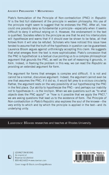Plato's formulation of the Principle of Non-contradiction (PNC) in Republic IV is the first full statement of the principle in western philosophy. His use of the principle might seem to suggest that he endorses the PNC. After all, how could one possibly deny so fundamental a principle-especially when it seems difficult to deny it without relying on it. However, the endorsement in the text is qualified. Socrates refers to the principle as one that he and his interlocutors will hypothesize and warns that if it should ever be shown to be false, all that follows from it will also be refuted. Scholars who have noticed this issue have tended to assume that the truth of the hypothesis in question can be guaranteed. Laurence Bloom argues against unthinkingly accepting this claim. He suggests that what emerges from the text is more sophisticated: Plato's concession that the PNC is hypothetical is a textual clue pointing us to a complex philosophical argument that grounds the PNC, as well as the sort of reasoning it grounds, in form. Indeed, in framing the problem in this way, we can read the Republic as providing an extended argument for form. The argument for forms that emerges is complex and difficult. It is not and cannot be a normal, discursive argument. Indeed, the argument cannot even be one that assumes the PNC; if it did so, it would fall prey to a vicious circularity. Rather, the argument rests on the very possibility of our hypothesizing the PNC in the first place. Our ability to hypothesize the PNC-and perhaps our inability not to hypothesize it-is the linchpin. When we ask questions such as "to what objects does the PNC apply?" or "how is it possible that we apply the PNC?," we are asking questions that lead us to the existence of form. The Principle of Non-contradiction in Plato's Republic also explores the soul of the knower-the very entity to which and by which the principle is applied in the text-and its underlying unity.