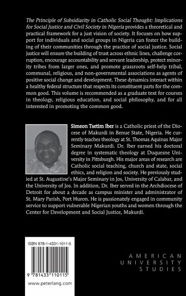 The Principle of Subsidiarity in Catholic Social Thought: Implications for Social Justice and Civil Society in Nigeria provides a theoretical and practical framework for a just vision of society. It focuses on how support for individuals and social groups in Nigeria can foster the building of their communities through the practice of social justice. Social justice will ensure the building of trust across ethnic lines, challenge corruption, encourage accountability and servant leadership, protect minority tribes from larger ones, and promote grassroots self-help tribal, communal, religious, and non-governmental associations as agents of positive social change and development. These dynamics interact within a healthy federal structure that respects its constituent parts for the common good. This volume is recommended as a graduate text for courses in theology, religious education, and social philosophy, and for all interested in promoting the common good.