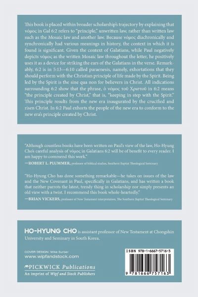 This book is placed within broader scholarship's trajectory by explaining that ¿¿¿¿¿ in Gal 6:2 refers to ""principle,"" unwritten law, rather than written law such as the Mosaic law and another law. Because ¿¿¿¿¿ diachronically and synchronically had various meanings in history, the context in which it is found is significant. Given the context of Galatians, while Paul negatively depicts ¿¿¿¿¿ as the written Mosaic law throughout the letter, he positively uses it as a device for striking the ears of the Galatians in the verse. Remarkably, 6:2 is in 5:13--6:10 called paraenesis, namely, exhortations that they should perform with the Christian principle of life made by the Spirit. Being led by the Spirit is the sine qua non for believers in Christ. All indications surrounding 6:2 show that the phrase, ¿¿ ¿¿¿¿¿ ¿¿¿ ¿¿¿¿¿¿¿ in 6:2 means ""the principle created by Christ,"" that is, ""keeping in step with the Spirit."" This principle results from the new era inaugurated by the crucified and risen Christ. In 6:2 Paul exhorts the people of the new era to conform to the new era's principle created by Christ.