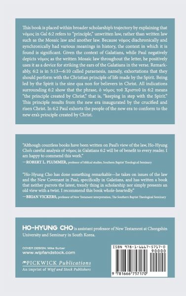 This book is placed within broader scholarship's trajectory by explaining that ¿¿¿¿¿ in Gal 6:2 refers to ""principle,"" unwritten law, rather than written law such as the Mosaic law and another law. Because ¿¿¿¿¿ diachronically and synchronically had various meanings in history, the context in which it is found is significant. Given the context of Galatians, while Paul negatively depicts ¿¿¿¿¿ as the written Mosaic law throughout the letter, he positively uses it as a device for striking the ears of the Galatians in the verse. Remarkably, 6:2 is in 5:13--6:10 called paraenesis, namely, exhortations that they should perform with the Christian principle of life made by the Spirit. Being led by the Spirit is the sine qua non for believers in Christ. All indications surrounding 6:2 show that the phrase, ¿¿ ¿¿¿¿¿ ¿¿¿ ¿¿¿¿¿¿¿ in 6:2 means ""the principle created by Christ,"" that is, ""keeping in step with the Spirit."" This principle results from the new era inaugurated by the crucified and risen Christ. In 6:2 Paul exhorts the people of the new era to conform to the new era's principle created by Christ.