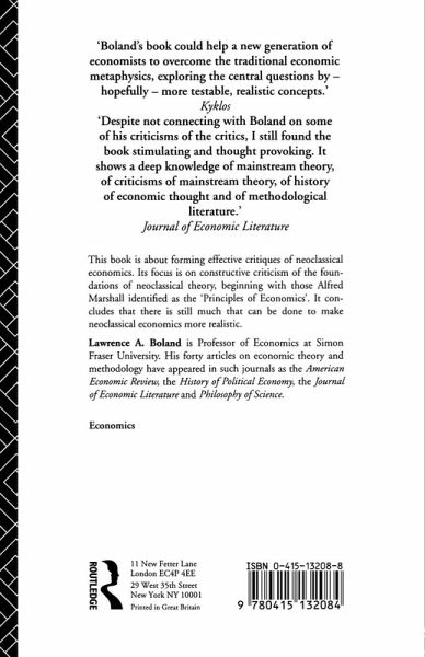 Boland's book will help a new generation of economists to overcome the traditional economic metaphysics, exploring the central questions by - hopefully - more testable, realistic concepts. This book is about forming effective critiques of neoclassical economics. Its focus is on constructive criticism of the foundations of neoclassical theory, beginning with what Alfred Marshall called the Principles of Economics'. It concludes that there is still much that can be done to make neoclassical economics more realistic.
