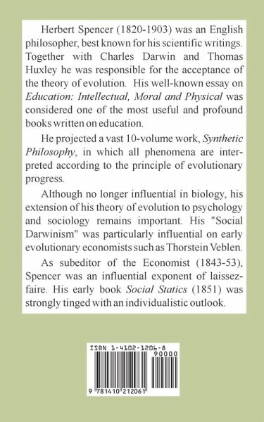 Herbert Spencer (1820-1903) was an English philosopher, best known for his scientific writings. Together with Charles Darwin and Thomas Huxley he was responsible for the acceptance of the theory of evolution. His well-known essay on Education: Intellectual, Moral and Physical was considered one of the most useful and profound books written on education. He projected a vast 10-volume work, Synthetic Philosophy, in which all phenomena are interpreted according to the principle of evolutionary progress. Although no longer influential in biology, his extension of his theory of evolution to psychology and sociology remains important. His "Social Darwinism" was particularly influential on early evolutionary economists such as Thorstein Veblen. As subeditor of the Economist (1843-53), Spencer was an influential exponent of laissez-faire. His early book Social Statics (1851) was strongly tinged with an individualistic outlook.