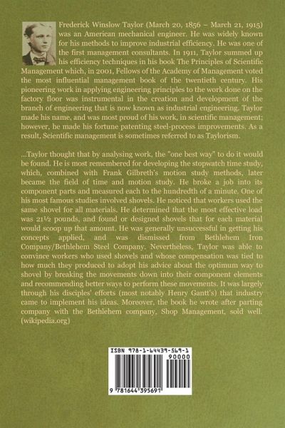 Frederick Winslow Taylor (March 20, 1856 - March 21, 1915) was an American mechanical engineer. He was widely known for his methods to improve industrial efficiency. He was one of the first management consultants. In 1911, Taylor summed up his efficiency techniques in his book The Principles of Scientific Management which, in 2001, Fellows of the Academy of Management voted the most influential management book of the twentieth century. His pioneering work in applying engineering principles to the work done on the factory floor was instrumental in the creation and development of the branch of engineering that is now known as industrial engineering. Taylor made his name, and was most proud of his work, in scientific management; however, he made his fortune patenting steel-process improvements. As a result, Scientific management is sometimes referred to as Taylorism. ...Taylor thought that by analysing work, the "one best way" to do it would be found. He is most remembered for developing the stopwatch time study, which, combined with Frank Gilbreth's motion study methods, later became the field of time and motion study. He broke a job into its component parts and measured each to the hundredth of a minute. One of his most famous studies involved shovels. He noticed that workers used the same shovel for all materials. He determined that the most effective load was 21¿ pounds, and found or designed shovels that for each material would scoop up that amount. He was generally unsuccessful in getting his concepts applied, and was dismissed from Bethlehem Iron Company/Bethlehem Steel Company. Nevertheless, Taylor was able to convince workers who used shovels and whose compensation was tied to how much they produced to adopt his advice about the optimum way to shovel by breaking the movements down into their component elements and recommending better ways to perform these movements. It was largely through his disciples' efforts (most notably Henry Gantt's) that industry came to implement his ideas. Moreover, the book he wrote after parting company with the Bethlehem company, Shop Management, sold well. (wikipedia.org)