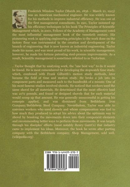 Frederick Winslow Taylor (March 20, 1856 - March 21, 1915) was an American mechanical engineer. He was widely known for his methods to improve industrial efficiency. He was one of the first management consultants. In 1911, Taylor summed up his efficiency techniques in his book The Principles of Scientific Management which, in 2001, Fellows of the Academy of Management voted the most influential management book of the twentieth century. His pioneering work in applying engineering principles to the work done on the factory floor was instrumental in the creation and development of the branch of engineering that is now known as industrial engineering. Taylor made his name, and was most proud of his work, in scientific management; however, he made his fortune patenting steel-process improvements. As a result, Scientific management is sometimes referred to as Taylorism. ...Taylor thought that by analysing work, the "one best way" to do it would be found. He is most remembered for developing the stopwatch time study, which, combined with Frank Gilbreth's motion study methods, later became the field of time and motion study. He broke a job into its component parts and measured each to the hundredth of a minute. One of his most famous studies involved shovels. He noticed that workers used the same shovel for all materials. He determined that the most effective load was 211/2 pounds, and found or designed shovels that for each material would scoop up that amount. He was generally unsuccessful in getting his concepts applied, and was dismissed from Bethlehem Iron Company/Bethlehem Steel Company. Nevertheless, Taylor was able to convince workers who used shovels and whose compensation was tied to how much they produced to adopt his advice about the optimum way to shovel by breaking the movements down into their component elements and recommending better ways to perform these movements. It was largely through his disciples' efforts (most notably Henry Gantt's) that industry came to implement his ideas. Moreover, the book he wrote after parting company with the Bethlehem company, Shop Management, sold well. (wikipedia.org)