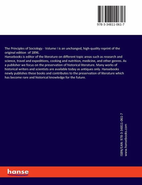 The Principles of Sociology - Volume I is an unchanged, high-quality reprint of the original edition of 1896.Hansebooks is editor of the literature on different topic areas such as research and science, travel and expeditions, cooking and nutrition, medicine, and other genres. As a publisher we focus on the preservation of historical literature. Many works of historical writers and scientists are available today as antiques only. Hansebooks newly publishes these books and contributes to the preservation of literature which has become rare and historical knowledge for the future.