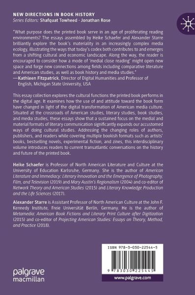 This essay collection explores the cultural functions the printed book performs in the digital age. It examines how the use of and attitude toward the book form have changed in light of the digital transformation of American media culture. Situated at the crossroads of American studies, literary studies, book studies, and media studies, these essays show that a sustained focus on the medial and material formats of literary communication significantly expands our accustomed ways of doing cultural studies. Addressing the changing roles of authors, publishers, and readers while covering multiple bookish formats such as artists' books, bestselling novels, experimental fiction, and zines, this interdisciplinary volume introduces readers to current transatlantic conversations on the history and future of the printed book.