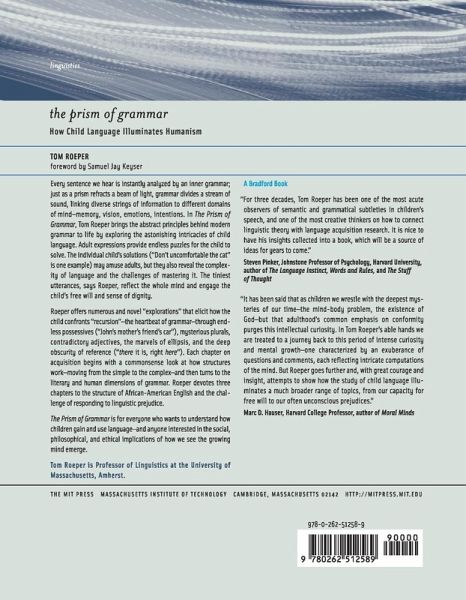 Exploring the creativity of mind through children's language: how the tiniest utterances can illustrate the simple but abstract principles behind modern grammar—and reveal the innate structures of the mind. Every sentence we hear is instantly analyzed by an inner grammar; just as a prism refracts a beam of light, grammar divides a stream of sound, linking diverse strings of information to different domains of mind—memory, vision, emotions, intentions. In The Prism of Grammar, Tom Roeper brings the abstract principles behind modern grammar to life by exploring the astonishing intricacies of child language. Adult expressions provide endless puzzles for the child to solve. The individual child's solutions ("Don't uncomfortable the cat" is one example) may amuse adults but they also reveal the complexity of language and the challenges of mastering it. The tiniest utterances, says Roeper, reflect the whole mind and engage the child's free will and sense of dignity. He offers numerous and novel "explorations"—many at the cutting edge of current work—that anyone can try, even in conversation around the dinner table. They elicit how the child confronts "recursion"—the heartbeat of grammar—through endless possessives ("John's mother's friend's car"), mysterious plurals, contradictory adjectives, the marvels of ellipsis, and the deep obscurity of reference ("there it is, right here"). They are not tests of skill; they are tools for discovery and delight, not diagnosis. Each chapter on acquisition begins with a commonsense look at how structures work—moving from the simple to the complex—and then turns to the literary and human dimensions of grammar. One important human dimension is the role of dialect in society and in the lives of children. Roeper devotes three chapters to the structure of African-American English and the challenge of responding to linguistic prejudice. Written in a lively style, accessible and gently provocative, The Prism of Grammar is for parents and teachers as well as students—for everyone who wants to understand how children gain and use language—and anyone interested in the social, philosophical, and ethical implications of how we see the growing mind emerge.